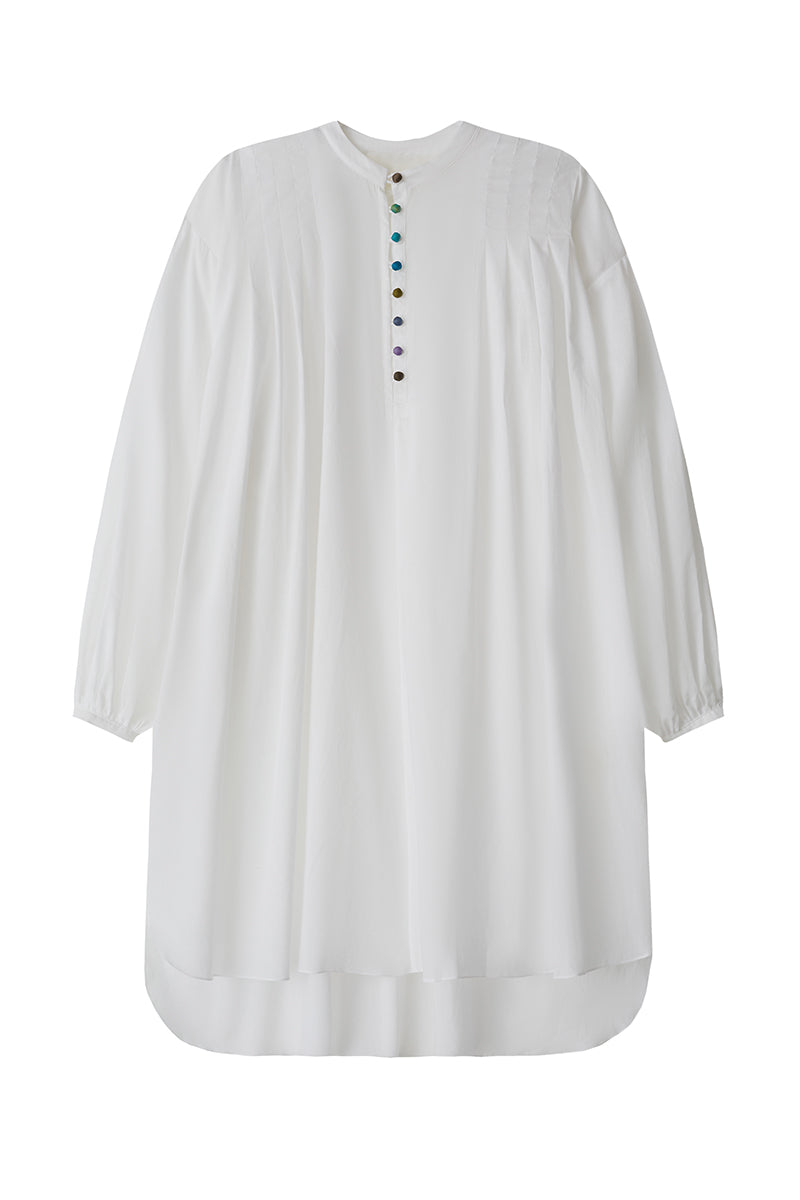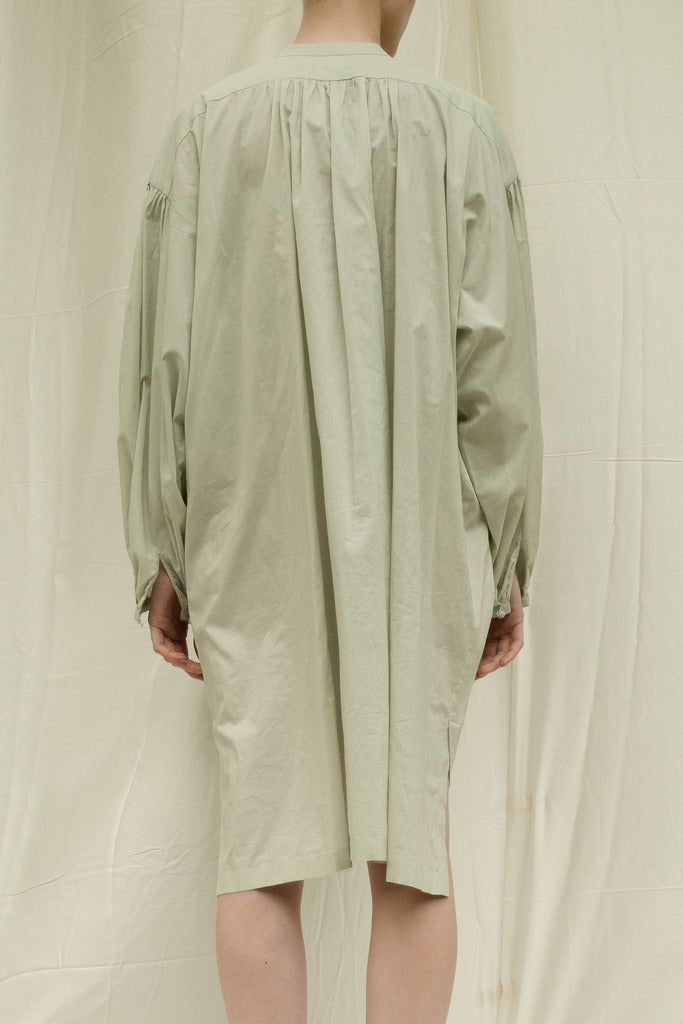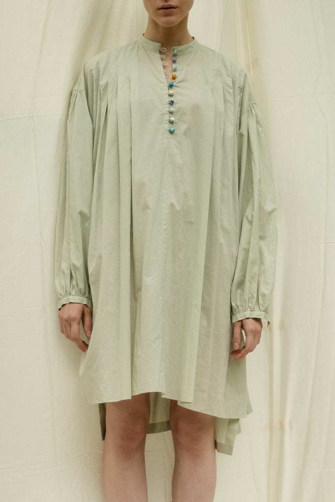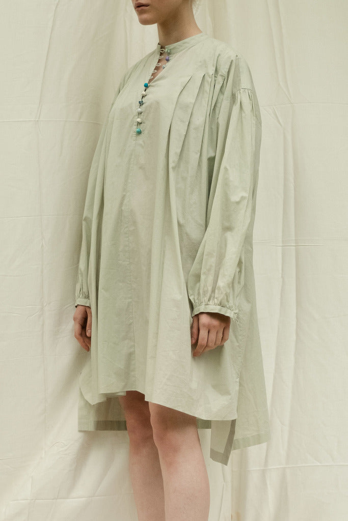Made of responsibly sourced light Indian cotton, in sage color, ornamented with sari silk handmade vintage buttons.