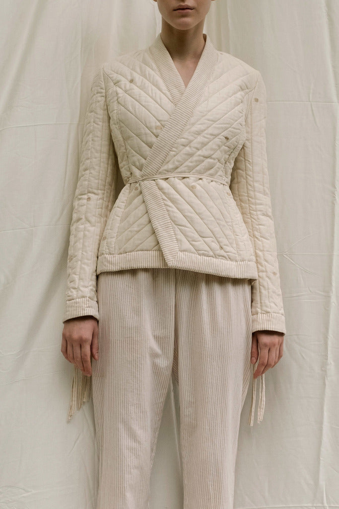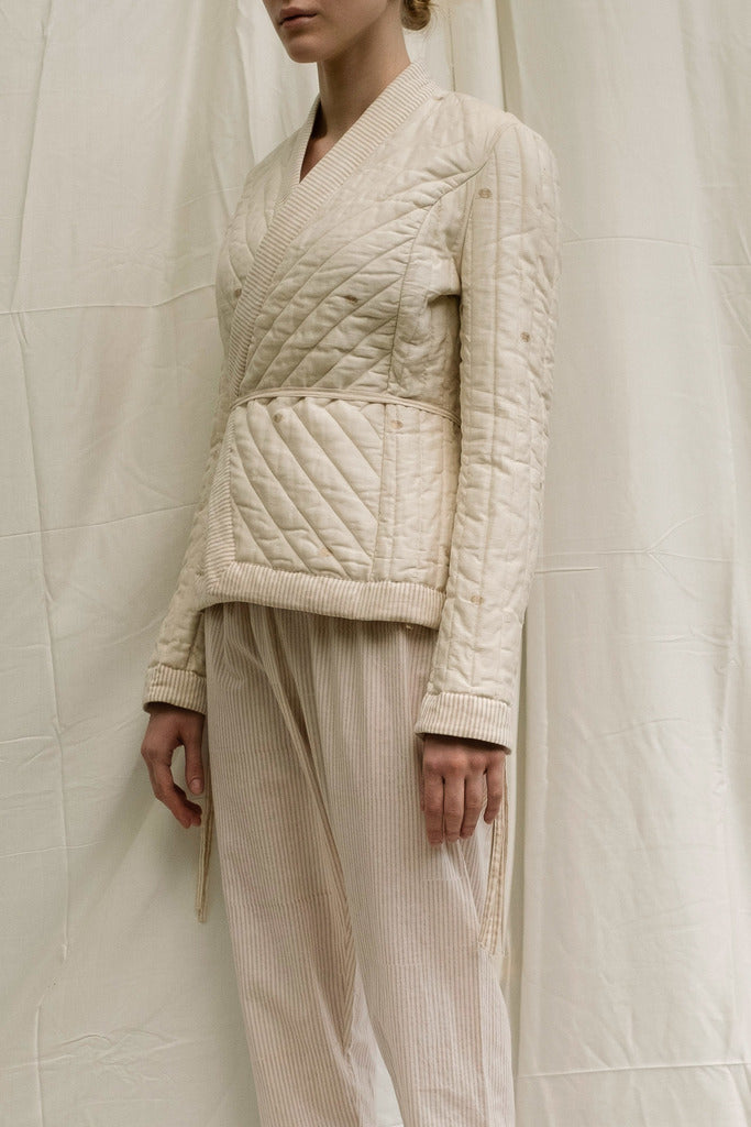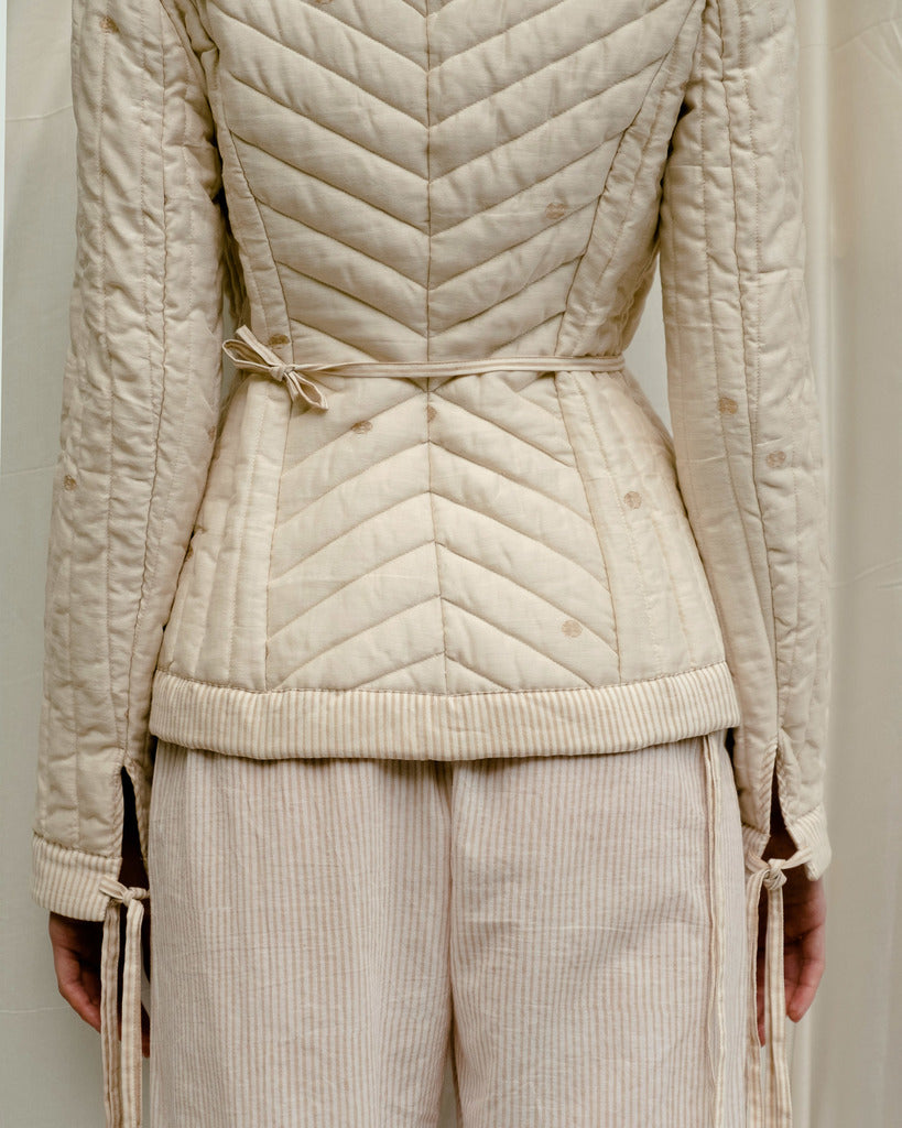 Quilted fitted jacket is made from ivory color hand loom Indian cotton. The mercerized fabric is ornamented with silver dots.